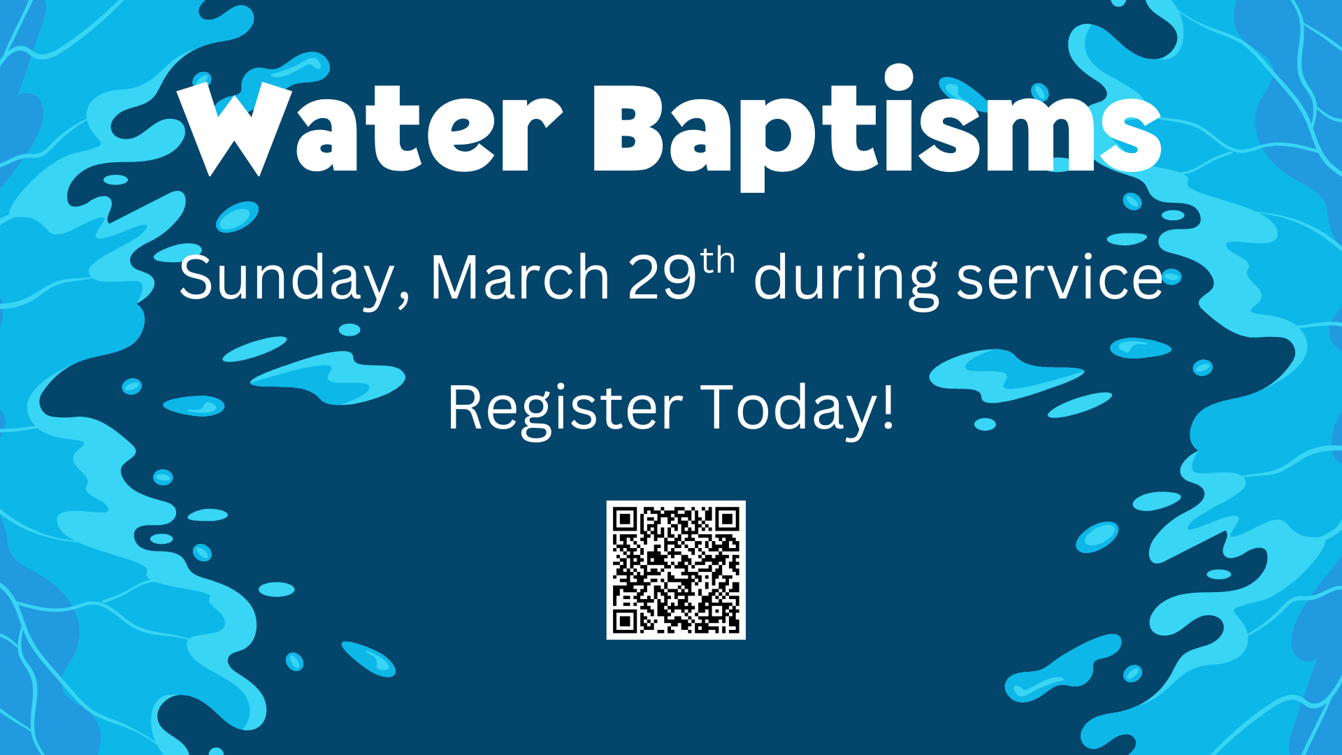 Water Baptisms Sunday, March 29, 2026 9:15 AM 10:00 AM Google Calendar ICS Scan the QR Code or click on the image above to register.